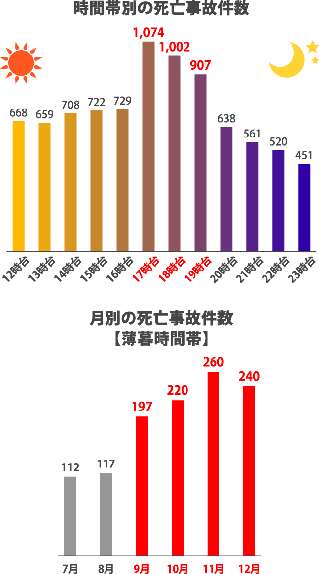 死亡事故は、1日の中で17時台~19時台に最も多く発生します。