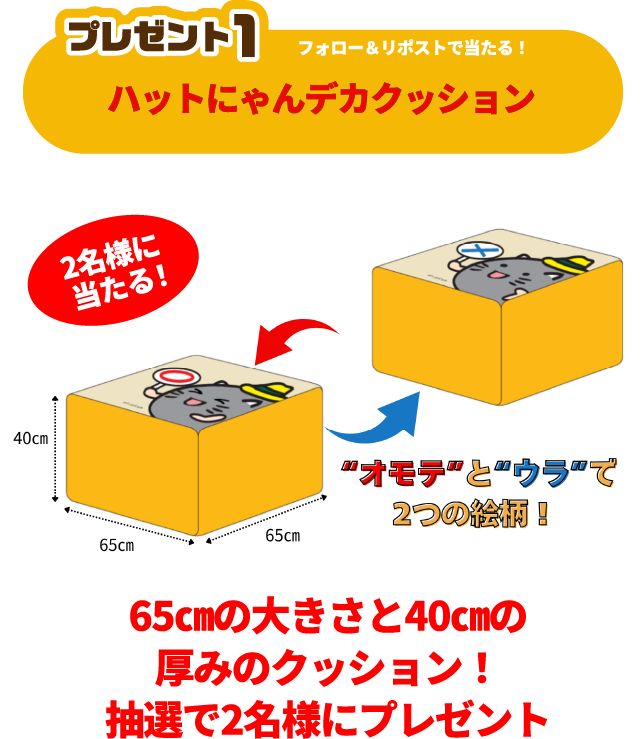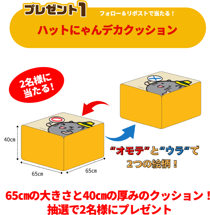①交通安全クイズに挑戦!ハットにゃんデカクッション 2名様