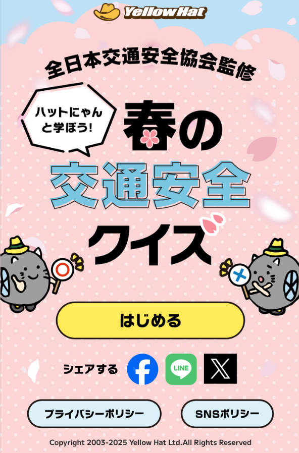 株式会社イエローハット(以下「当社」といいます)が実施する「春の全国交通安全運動」応援キャンペーン(以下「本キャンペーン」といいます)は、この規約(以下「本規約」といいます)に従って実施されます。