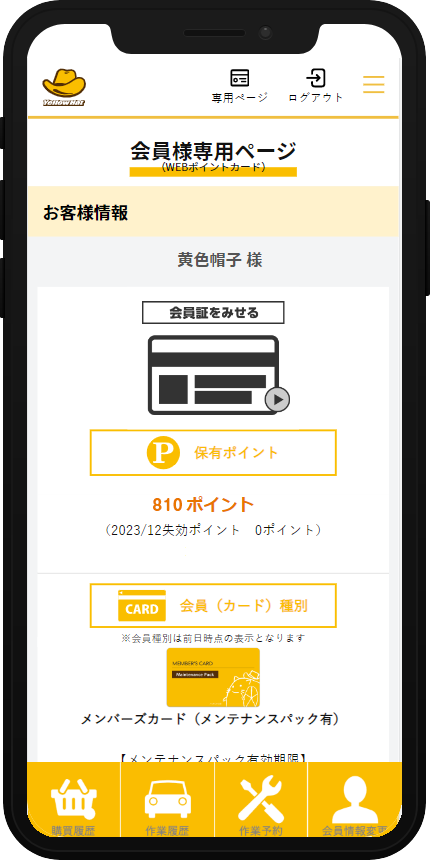 会員様ひとりひとりの専用ページだから、ポイントの確認や愛車のメンテナンス状況がわかります。また、店舗独自のお得な情報が確認できます。