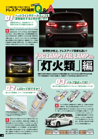 Q&A%u30a4%u30b8%u308b%u524d%u306b%u77e5%u3063%u3066%u304a%u304f%u3079%u304d%u3053%u3068%u30c9%u30ec%u30b9%u30a2%u30c3%u30d7%u306e%u7591%u554f%u521d%u5fc3%u8005%u6b53%u8fce%u300c%u706f%u706b%u985e%u300d%u7de8%u5b9f%u7528%u6027%u304c%u5411%u4e0a%u3001%u30c9%u30ec%u30b9%u30a2%u30c3%u30d7%u52b9%u679c%u3082%u9ad8%u3044%uff01FOG LAMP&TAIL LAMP etc%u6697%u95c7%u3067%u306e%u8d70%u884c%u3084%u66f2%u304c%u308b%u30fb%u6b62%u307e%u308b%u306a%u3069%u306e%u884c%u52d5%u3092%u5468%u56f2%u306b%u77e5%u3063%u3066%u3082%u3089%u3046%u305f%u3081%u306b%u5fc5%u8981%u4e0d%u53ef%u6b20%u306a%u706f%u706b%u985e%u3002%u30d0%u30eb%u30d6%u3092%u9ad8%u52b9%u7387%u30bf%u30a4%u30d7%u306a%u3069%u306b%u4ea4%u63db%u3057%u3066%u3001%u5149%u91cf%u3092%u30a2%u30c3%u30d7%u3055%u305b%u308b%u306e%u3082%u4eba%u6c17%u306e%u30ab%u30b9%u30bf%u30de%u30a4%u30ba%u3002%u4f8b%u3048%u3070%u30d8%u30c3%u30c9%u30e9%u30a4%u30c8%u3084%u30d5%u30a9%u30b0%u30e9%u30f3%u30d7%u306e%u30d0%u30eb%u30d6%u3092%u7d14%u6b63%u54c1%u304b%u3089%u30b0%u30ec%u30fc%u30c9%u30a2%u30c3%u30d7%u3059%u308c%u3070%u3001%u524d%u65b9%u306e%u8996%u8a8d%u6027%u304c%u5927%u304d%u304f%u5411%u4e0a%u3002%u5149%u304c%u3088%u308a%u660e%u308b%u304f%u306a%u308b%u3001%u5149%u306e%u7167%u5c04%u7bc4%u56f2%u304c%u5e83%u304c%u308b%u306a%u3069%u306e%u5229%u70b9%u304c%u3042%u308a%u3001%u591c%u9593%u3084%u30c8%u30f3%u30cd%u30eb%u306a%u3069%u6697%u3044%u5834%u6240%u3092%u8d70%u308b%u969b%u306b%u5f79%u7acb%u3064%u3002%u307e%u305f%u30c6%u30fc%u30eb%u30e9%u30f3%u30d7%u306e%u30d0%u30eb%u30d6%u3082%u5fdc%u7b54%u6027%u306e%u901f%u3055%u304c%u7279%u5fb4%u306eLED%u306b%u4ea4%u63db%u3059%u308b%u3068%u3001%u5f8c%u7d9a%u8eca%u306b%u30d6%u30ec%u30fc%u30ad%u4f5c%u52d5%u306e%u6319%u52d5%u3092%u3088%u308a%u8fc5%u901f%u306b%u5468%u77e5%u3067%u304d%u308b%u3002%u305d%u3057%u3066%u7d14%u6b63%u304b%u3089%u660e%u308b%u307f%u3084%u8272%u5408%u3044%u304c%u5909%u308f%u308b%u305f%u3081%u3001%u30c9%u30ec%u30b9%u30a2%u30c3%u30d7%u3068%u3057%u3066%u3082%u6700%u9069%u3002A%u8996%u8a8d%u6027%u304c%u5411%u4e0a%u3057%u3001%u5b89%u5168%u6027%u304c%u30a2%u30c3%u30d7%u898b%u6804%u3048%u3082%u826f%u304f%u306a%u308a%u500b%u6027%u5316%u3082%u56f3%u308c%u308b%u30d8%u30c3%u30c9%u30e9%u30a4%u30c8%u3084%u30c6%u30fc%u30eb%u30e9%u30f3%u30d7%u309201%u9ad8%u6027%u80fd%u5316%u3059%u308b%u3068%u4f55%u304c%u826f%u3044%u306e%uff1f%u7701%u30a8%u30cd%u3067%u9577%u5bff%u547d%u3001%u30b7%u30e3%u30fc%u30d7%u306a%u5149%u304c%u7279%u5fb4%u3067%u3059%uff01%u53d6%u308a%u4ed8%u3051%u7b87%u6240%u306e%u5f62%u72b6%u3084%u30b5%u30a4%u30ba%u306b%u3088%u3063%u3066%u578b%u5f0f%u306f%u5909%u308f%u3063%u3066%u304f%u308b%uff01LED%u3063%u3066%u4f55%u3067%u3059%u304b%uff1f%u30d0%u30eb%u30d6%u578b%u5f0f%u3063%u3066%u4f55%uff1f0203%u6614%u304b%u3089%u30af%u30eb%u30de%u7528%u306e%u30d0%u30eb%u30d6%u3068%u3057%u3066%u4f7f%u308f%u308c%u3066%u304d%u305f%u30cf%u30ed%u30b2%u30f3%u3068%u6bd4%u3079%u308b%u3068%u660e%u308b%u304f%u3001%u5bff%u547d%u304c%u9577%u304f%u3066%u7701%u96fb%u529b%u3001%u5fdc%u7b54%u6027%u304c%u901f%u3044%u3068%u3044%u3046%u30e1%u30ea%u30c3%u30c8%u304c%u3042%u308b%u3002%u30ec%u30c3%u30c9%u3084%u30a2%u30f3%u30d0%u30fc%u306a%u3069%u30af%u30eb%u30de%u306e%u30d0%u30eb%u30d6%u306b%u6c42%u3081%u3089%u308c%u308b%u8272%u5408%u3044%u3082%u5bb9%u6613%u306b%u8868%u73fe%u53ef%u80fd%u3002%u305d%u306e%u826f%u3055%u304c%u81ea%u52d5%u8eca%u30e1%u30fc%u30ab%u30fc%u306b%u3082%u6d78%u900f%u3057%u3001%u5c11%u3057%u524d%u304b%u3089%u7d14%u6b63%u3067%u3082%u706f%u706b%u985e%u306eLED%u5316%u304c%u9032%u3093%u3067%u3044%u308b%u3002LED%u7d20%u5b50%u3082%u9032%u5316%u3092%u7d9a%u3051%u3001%u8584%u578b%u304b%u3064%u5c0f%u578b%u306e%u30c1%u30c3%u30d7%u30bf%u30a4%u30d7%u304c%u666e%u53ca%u3057%u305f%u3053%u3068%u3067%u3088%u308a%u591a%u304f%u306e%u7d20%u5b50%u3092%u30de%u30a6%u30f3%u30c8%u3059%u308b%u3053%u3068%u304c%u53ef%u80fd%u3068%u306a%u3063%u305f%u3002ALED%u7d20%u5b50%u304c%u660e%u308b%u3055%u3092%u7dad%u6301%u3057%u306a%u304c%u3089%u5c0f%u3055%u304f%uff06%u8584%u304f%u306a%u3063%u305f%u3053%u3068%u3067%u3001%u3088%u308a%u591a%u304f%u306e%u7d20%u5b50%u3092%u7406%u60f3%u7684%u306a%u30b9%u30da%u30fc%u30b9%u306b%u914d%u7f6e%u3067%u304d%u308b%u3088%u3046%u306b%u306a%u3063%u305f%u3002%u3086%u3048%u306b%u5149%u3092%u5e83%u7bc4%u56f2%u3067%u7167%u5c04%u3067%u304d%u3066%u5b9f%u7528%u6027%u30a2%u30c3%u30d7%u3002%u9762%u7a4d%u304c%u72ed%u3044%u30eb%u30fc%u30e0%u30e9%u30f3%u30d7%u306b%u3082%u4f7f%u308f%u308c%u308b%u3002%u30d0%u30eb%u30d6%u306e%u5f62%u72b6%u306b%u306f%u898f%u683c%u304c%u3042%u308a%u3001%u5834%u6240%u306b%u3088%u3063%u3066%u4f7f%u308f%u308c%u308b%u5f62%u72b6%u304c%u7570%u306a%u308b%u3002%u5dee%u3057%u8fbc%u307f%u90e8%u306f%u629c%u304d%u5dee%u3057%u3057%u3084%u3059%u3044%u30a6%u30a7%u30c3%u30b8%u30bf%u30a4%u30d7%u3001%u53e4%u304f%u304b%u3089%u96fb%u7403%u306b%u4f7f%u308f%u308c%u3066%u3044%u308b%u53e3%u91d1%u30bf%u30a4%u30d7%u306a%u3069%u30d0%u30eb%u30d6%u306b%u3088%u3063%u3066%u5927%u304d%u304f%u9055%u3046%u3002%u7279%u306b%u30d8%u30c3%u30c9%u30e9%u30a4%u30c8%u306f%u4f7f%u308f%u308c%u308b%u30d0%u30eb%u30d6%u304c%u8eca%u7a2e%u306b%u3088%u308a%u69d8%u3005%u3067%u30011%u3064%u306e%u30d0%u30eb%u30d6%u3067%u30cf%u30a4%u30d3%u30fc%u30e0%u3068%u30ed%u30fc%u30d3%u30fc%u30e0%u306e%u6a5f%u80fd%u3092%u517c%u306d%u5099%u3048%u3066%u3044%u308b%u306e%u3082%u3042%u308c%u3070%u3001%u30cf%u30a4%u3068%u30ed%u30fc%u304c%u72ec%u7acb%u5f0f%u306e%u30d0%u30eb%u30d6%u3092%u63a1%u7528%u3055%u308c%u3066%u3044%u308b%u3053%u3068%u3082%u3042%u308b%u3002%u8cb7%u3046%u524d%u306b%u9069%u5408%u8868%u3067%u5404%u90e8%u306e%u30d0%u30eb%u30d6%u5f62%u72b6%u3092%u78ba%u8a8d%u3057%u3088%u3046%u3002AT10T16T20%u30d5%u30a9%u30b0%u30e9%u30f3%u30d7LED or T16%u30a6%u30a4%u30f3%u30ab%u30fc%uff08%u524d%uff09T20%u30d4%u30f3%u30c1%u90e8%u9055%u3044%u30d0%u30c3%u30afT16%u30a6%u30a4%u30f3%u30ab%u30fc%uff08%u5f8c%uff09T20%u30d4%u30f3%u30c1%u90e8%u9055%u3044%u30eb%u30fc%u30e0%uff08%u524d%uff09LED or T10%u30eb%u30fc%u30e0%uff08%u6a2a%uff09T10%uff3b30%u30a2%u30eb%u30d5%u30a1%u30fc%u30c9%u306e%u5834%u5408%uff3d %u30a8%u30af%u